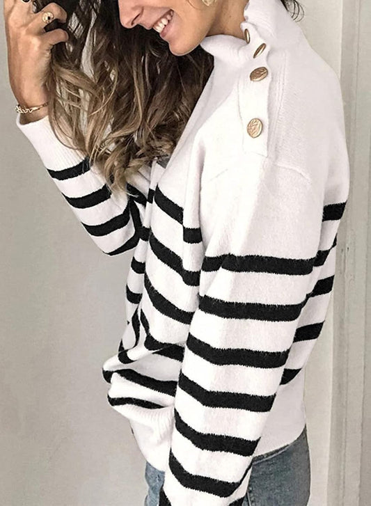 Striped Turtleneck Button Knit Sweaters for Women Lightweight Long Sleeve Knit Pullover Jumper Tops