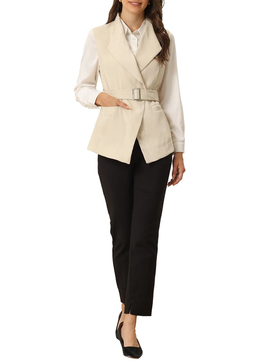 Women'S Shawl Collar Open Front Belted Sleeveless Blazer Vest M Apricot